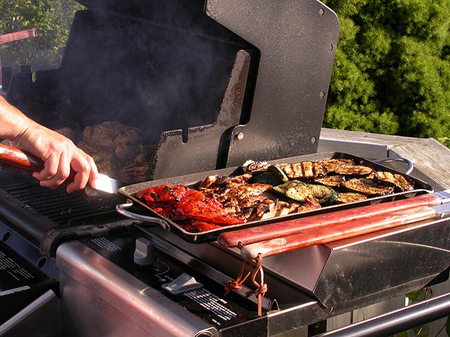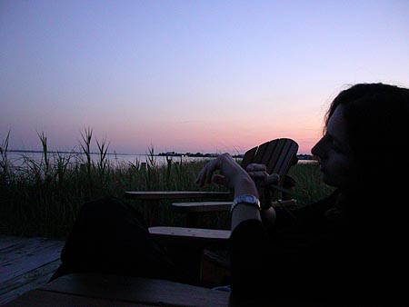 coming back without her hat which blew away in the wind. dan and i helped the ladies carry the boat back onshore. soon people were hungry enough that it was time for dinner (lionel returned to the city, to take care of his dog). michelle's husband is a chef so of course the responsibility of cooking rested on his shoulders, whether he wanted to or not. we had a barbecue and had some tasty homemade burgers as well as slices of steak. the amount of food was just enough that people were fighting over scraps, and vegetarians (mariane) became carnivores (at least for one night).