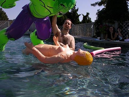 the beach is fun and all, and a great place to people watch, but real swimming takes place back at the house in the pool. i took the opportunity to re-introduce my blow-up sex doll "sandy duncan." we fought each other with our inflatable toys and i floated in the pool on a water noodle.