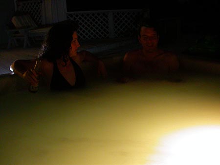 finally, around 1am, john and deanna came back from the hospital, along with christine, and sean in an arm sling. they looked exhausted, having spent most of the night in the waiting room. a handful of us piled into the hot tub for a late evening dip, talking celebrity gossip with megan.