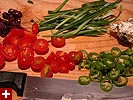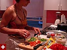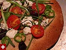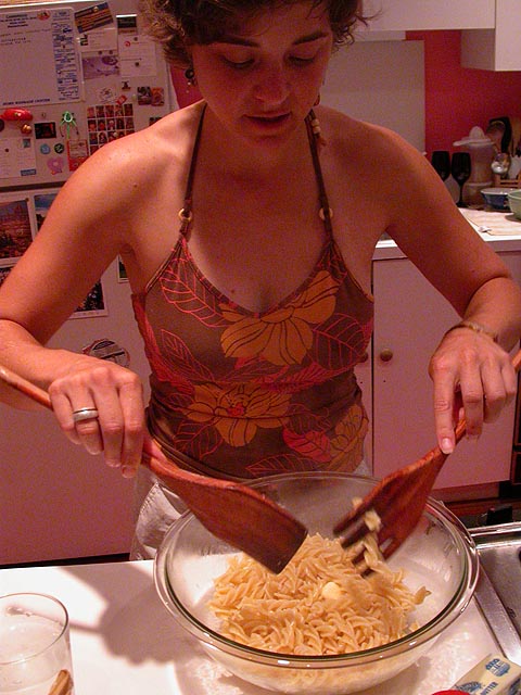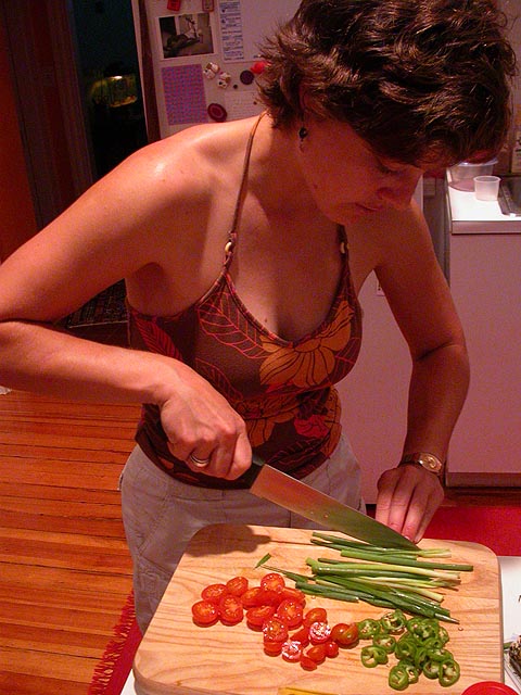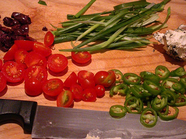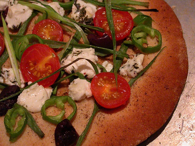 julie made pita bread pizza tonight, along with pasta blended with homemade basil pesto. the pasta could've used some bits of saltiness, like some kind of italian bacon, but the pita bread pizza was very good, all the trappings of gourmet italian pies (it didn't even use tomato sauce, what a revolutionary idea!).