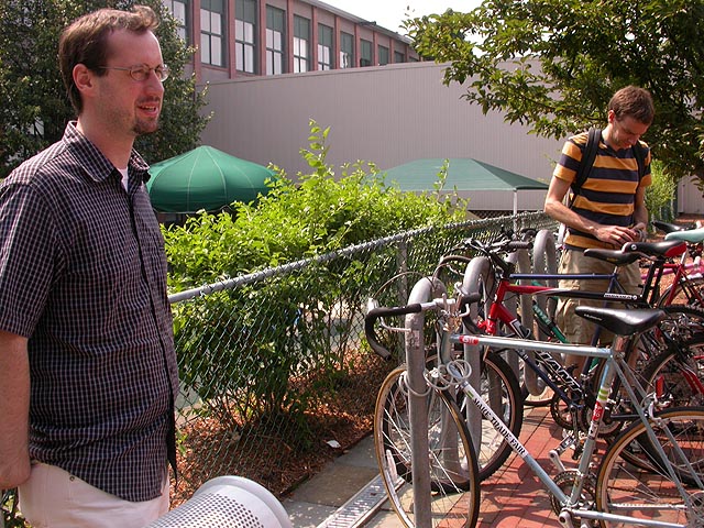 who do i see on the sidewalk but dan, still about a 20-25 minute walk away from kendall. i had my spare helmet and was able to give him a ride. the theatre was crowded for some reason (cheap weekend moviegoers trying to cash in on the matinee prices and enjoy the AC on a scorchingly hot day) and while dan and i waited in line to buy or tickets, rob showed up.