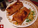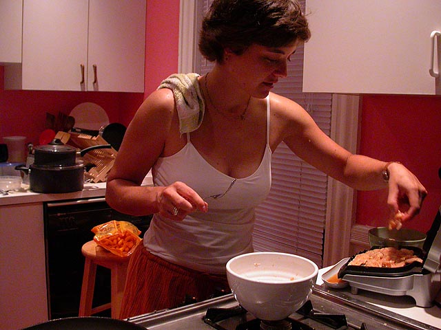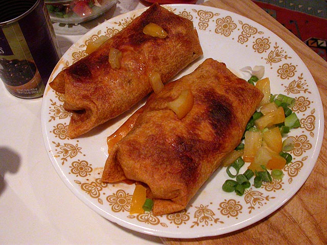 julie came over in the evening with plans on making some pita bread pizza and some chimichangas. chimichangas were actually more of a joke, when she called me in the bog i blurted out chimichangas because i liked the sound of the name, not even really sure what kind of food it was. julie did some research and found a recipe and we made that tonight. chimichangas are essentially glorified baked burritos. the ones we made were big enough that we decided to forgo the pizza. the chimichangas were good (the crispy skin is my favorite) but julie made them super spicy and i was literally in tears. after i was done with dinner, i could still feel the heat inside my stomach.