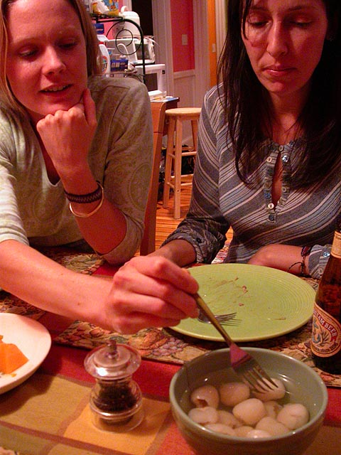occasionally pausing for a moment of silence to name that 80's tune. i didn't realize eliza doesn't like mushrooms (along with bananas and avocados), as she played around with all the mushroom bits left on her plate. both eliza and jerica tried the leechees (they've never had it from a can before), which they agreed looked like eyeballs. originally we wanted to make the 9:20 showing but stayed too late, so we ended up going to the 10:10 showing (last one of the evening).
