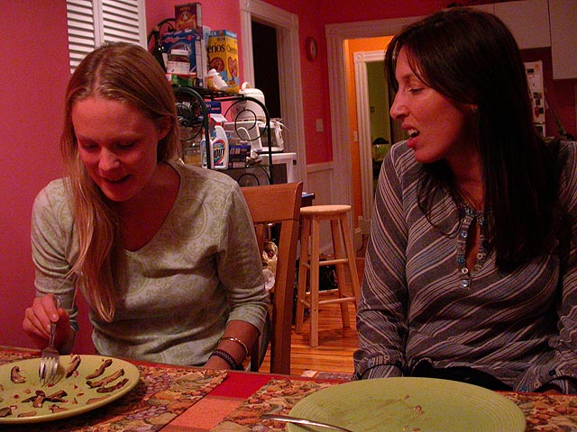 they came separately, jerica being the first to arrive in her pink barbie mobile. she had a present for me, a retro invisible ink quiz & game book, "for ages 15-115," and "hours of hours of 'by-yourself-enjoyment'". eliza came later via bicycle and asked if she could put her ride inside the house (this ain't no JP! i've left my bike in my cambridge backyard for weeks and all that'd happened to it was it got rusty). i gave each of them a present, a handmade bracelet i picked up in luang prabang, laos.