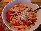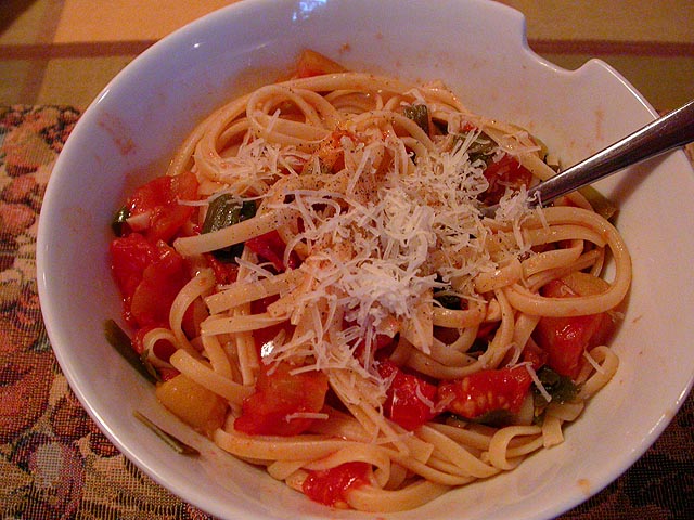 when she told me that tomatoes, basil, scallions, garlic, and some olive oil (along with pasta) were all we needed to make dinner, i didn't believe her ("no way," was what i said). like some sort of magician though, she chopped everything up and threw it into a pan adding some salt, pepper, and sugar, and before i knew what was happening (i was too busy prancing around the kitchen in my apron), dinner was ready. my one saving grace was i managed to make berry smoothies for everyone.