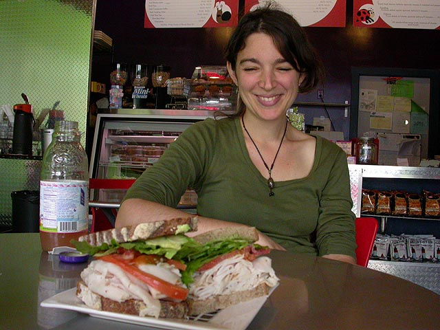 feeling guilty, we decided to first visit the supermarket to buy something from their store (specializing in south american/caribbean groceries), thereby legitimizing our parking. we hoped to maybe just buy sandwiches from the market but they didn't have anything like that. then we decided we could make our own sandwiches, but seeing the lack ingredients and the hassle it'd be, renata decided we'd just get sandwiches next door. so after buying a few items, we went to the cafe to share a turkey sandwich.
