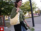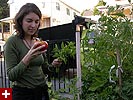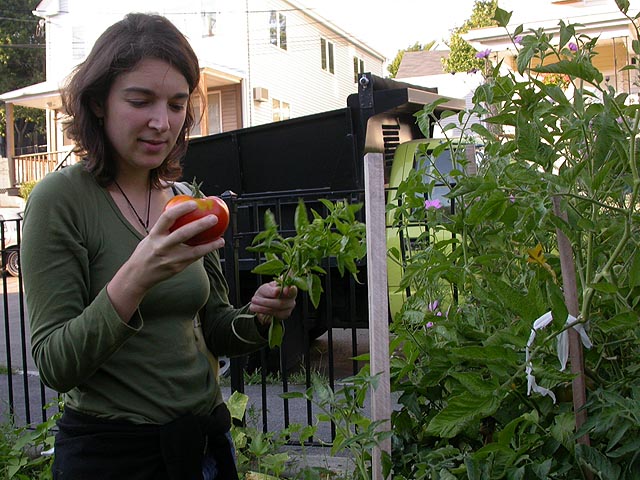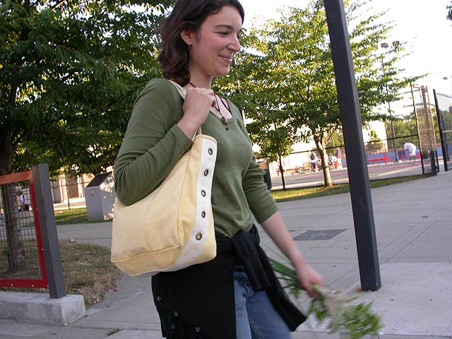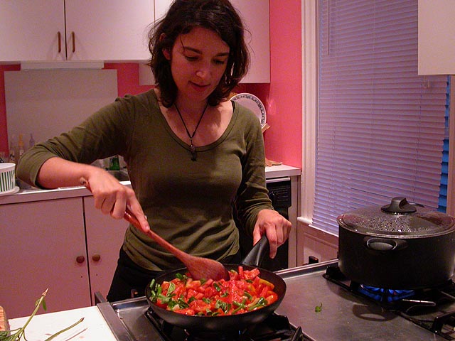 we wavered back and forth between making something at home or going out to eat; finally renata decided we would eat in. while marsian slept on the couch with the television on, renata and i walked to julie's garden to pick some ingredients. "you know, this is the longest time we've spent together all this month," renata informed me. "sick of me already?" i replied, jokingly. "this is what i really wanted to do all day," she said, "to go somewhere quiet, and pick vegetables." we ended up harvesting some fresh tomatoes, basil, and scallions. we used julie's special yellow canvas bag to transport the produce back to my place.