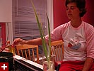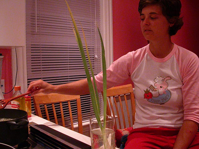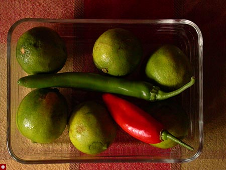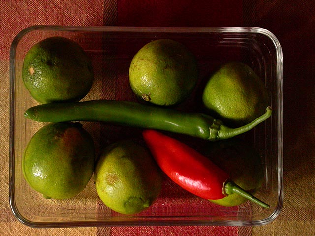 i went to my parents' cafe to drop off some leftover tomatoes i couldn't use. in return they gave me a cucumber and some limes, as well as a sample hot pepper (the red one in the photo above, the long green one is from julie's garden) they've been growing behind the cafe. it's more of a pepper bush now, and hot peppers hang from it in shades of green, orange, yellow, and red, like christmas lights. this particular pepper my father grew from a seed we got from our friend when we visited costa rica. originally i thought it was a habañero, but the peppers themselves look like jalapeños. the plant itself is so tough, you have to snip off the peppers with a pair of scissors because the stems don't easily break.
