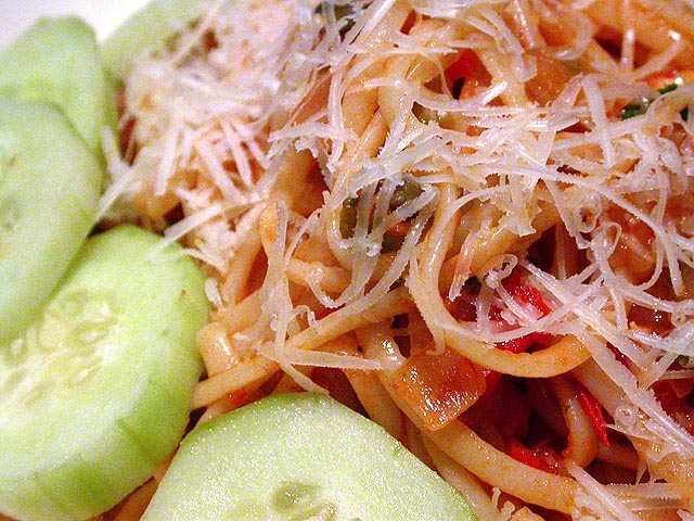 this is a chef's dream, to use fresh ingredients over canned ingredients, but because i wasn't using paste, it took longer to reduce the sauce to something that wasn't so watery. the final sauce was served mixed with linguine and chopped parsley with a garnish of cucumber slices and dusted with grated parmesan cheese. julie said the sauce tasted like a clam sauce, which i agree, minus the actual clams. the 5 pieces of anchovies i added gave the sauce a slight seafood flavor (but it wasn't overwhelming), and the finely chopped red hot jalapeño pepper left a trace of spiciness. the cheese really ties everything together, even though i read somewhere that cheese normally isn't served with puttanesca.