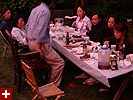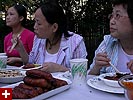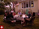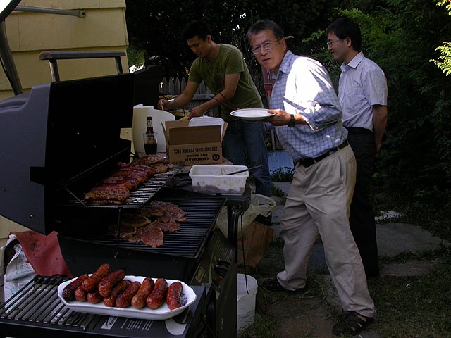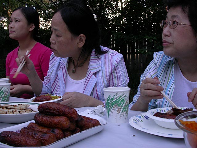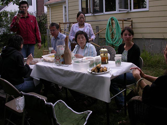 in the late afternoon jawei rode on the back of my motorcycle and we went to belmont where my family was having a barbecue. my mother-father-sister were there, along with my aunt, and a beijing couple who lives near the cafe. suhan was there too, and later his girlfriend and her taiwanese roommates arrived from allston. my godmother came too (unfortunately both godsons had to work tonight). last but not least, renata came as well, whom amongst the people i know my parents like the best, so she was granted a special invitation. even though she was told not to bring anything, renata still brought a bag of apples.