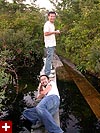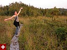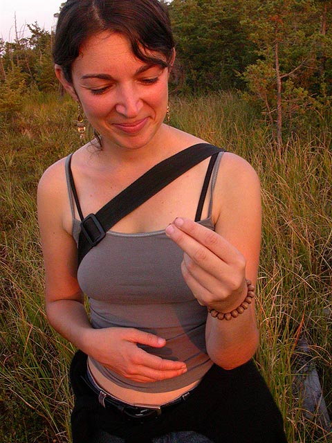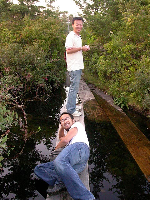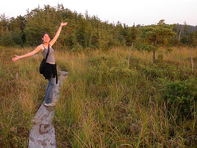 i got in touch with renata, would said she'd wait for us at her place. jawei and i took the subway and headed to JP. since neither of us had any lunch yet, we ordered a large steak & cheese sub to split. walking to renata's place, she surprised us outside, carrying a duffle bag of wet, clean clothes. jawei and i ate our sub as renata separated her laundry. renata had proposed an alternative outing of the arnold arboretum combined with jamaica pond, but i thought the bog would be cooler so we decided to visit ponkapoag. while she and jawei chatted in broken chinese and english, i went online to confirm the route. we piled into renata's car and drove headfirst into rush hour traffic. wouldn't you know it, as soon as we entered blue hill, i got lost again, and accidently directed renata onto I-93, a stretch of highway that under normal circumstances renata would refuse to drive on. finally we had to stop and ask directions from a fireman. by the time we found the entrance to the ponkapoag trail, the sun was already low on the horizon. nevertheless, i lead the expedition into the bog.