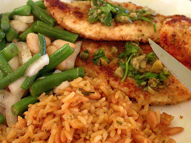 after going through back issues of everyday food magazines to find some recipes, i ended up deciding to make some instant spanish rice pilaf, string beans salad, and chicken cutlets with an olive relish.