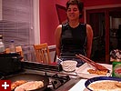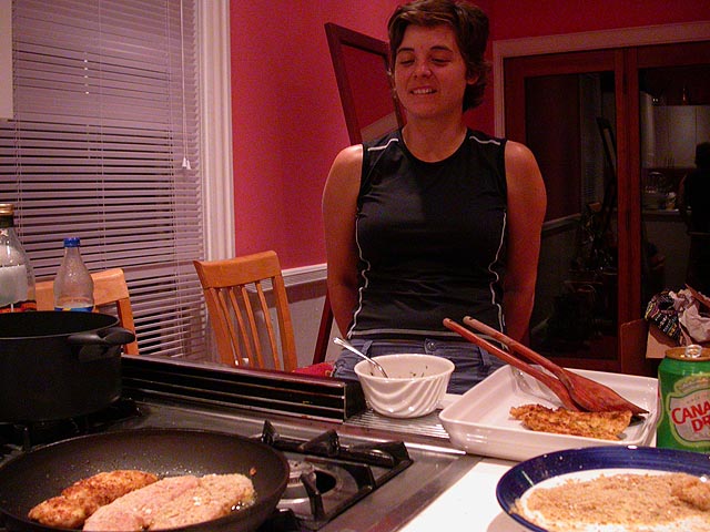 jawei and i started cooking before julie arrived; i was gathering up the ingredients while jawei cut the beans. by the time julie arrived, the pilaf was almost done and the only thing left to do was to fry the chicken cutlets in olive oil. the final dinner medley didn't turn out too bad (which is rare, i'm very critical of my own cooking), and the extra piece of cutlet back in the kitchen mysteriously disappeared which i take to be a good sign that the food was somewhat delicious.