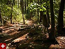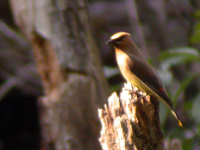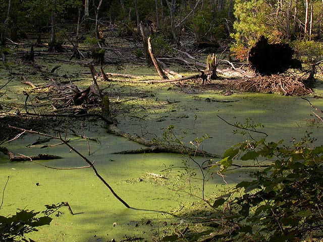 i followed the tophet loop northwards (sort of misleading, it's more of straight path than an actual loop), to heartbreak ridge. here the swamp hadn't dried up yet, instead a body of water covered in green duck weed with dead trees poking out from the swamp. i saw cedar waxwings hunting for dinner,
