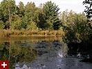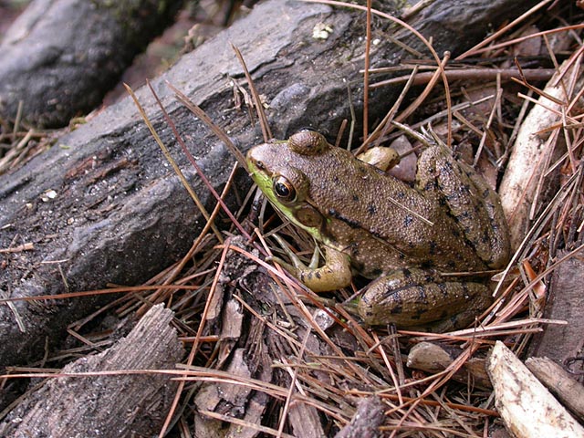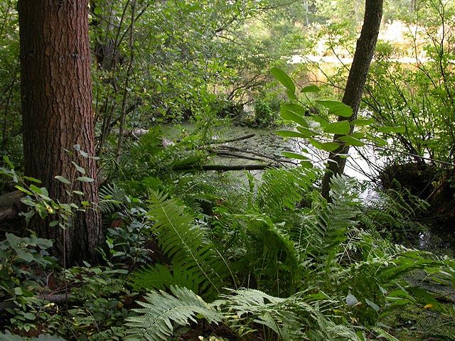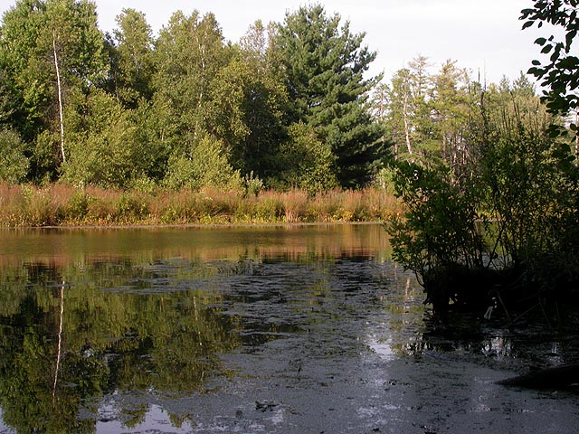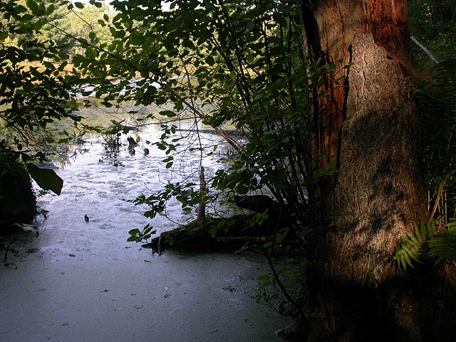 swooping down and snatching dragonflies out of the air. i stood my ground and took some photos, even though i was worried about getting mosquito bites (i didn't spray). i then kept on going north until i arrived at meadow pond and walked around the edge of the water (under a canopy of tall evergreens, the ground a carpet of soft pine needles), scaring frogs in the process, who'd suddenly jumping back into the pond as i came around.