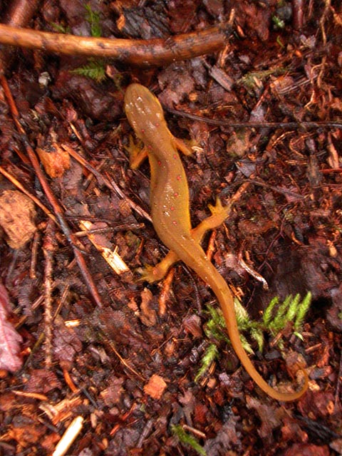 pointing to it as we went by. one noteworthy item we found was an olive-colored eft (hard to tell from the photo); it displayed some characteristics of emerging adulthood, for instance the color change, along with a flattened tail and things on the side of its head that could be pre-gills. when we flipped it over we saw a bright yellow underbelly.