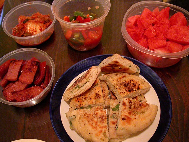 we stopped at the cafe, where renata grabbed all her stuff and went home in her car, while my father gave jawei and i a ride back to our place. later in the evening, my parents and my aunt came over with dinner, homemade scallion pancakes.