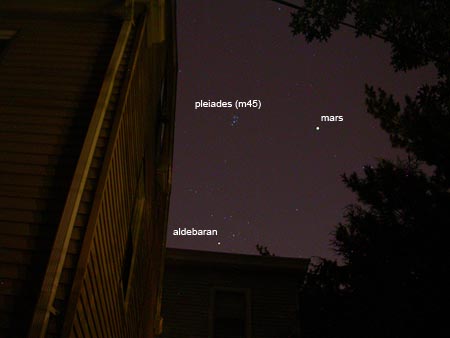 after midnight, with jawei in his bedroom studying over his english vocabulary, i went outside on the backyard deck and saw a bright "star" in the sky that i knew right away to be the planet mars. i showed jawei, along with the constellation taurus (aldebaran forms the eye of the bull) and the open cluster M45 aka the pleiades. i really should get back to astronomy, my winter sport of choice. (photo taken with my nikon 4500 on an 8-second time-lapse exposure using a tripod).