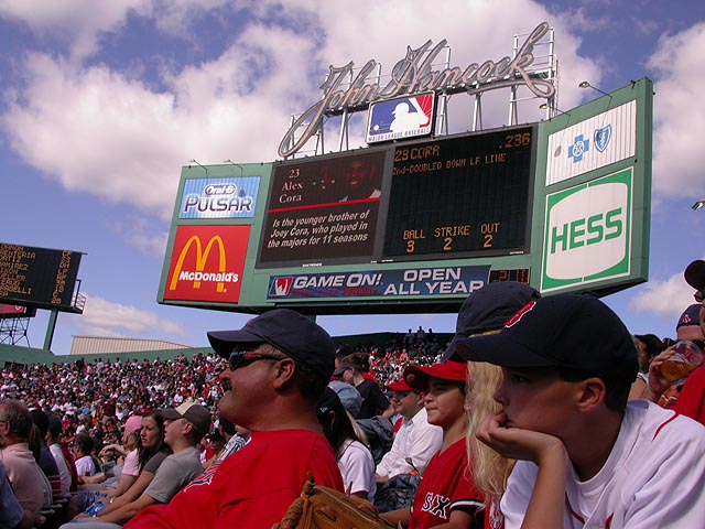in the crowd. the thing with seeing a baseball game live is that the game almost becomes secondary; i'm too busy being distracted by the sights of sounds of the ball park, the people watching, the eavesdropping, the spectacle of red sox nation. there were a lot of ortiz and ramirez and varitek t-shirts, but occasionally you'd find that person who's a fan of timlin or renteria, or old-school fans of shea hillenbrand (former red sox player now a bluejay). we sat behind a pair of mothers with their kids; the children were especially animated and i was hoping their cuteness would be caught on camera so i could get a chance to be on the jumbotron (or better yet, broadcast television).