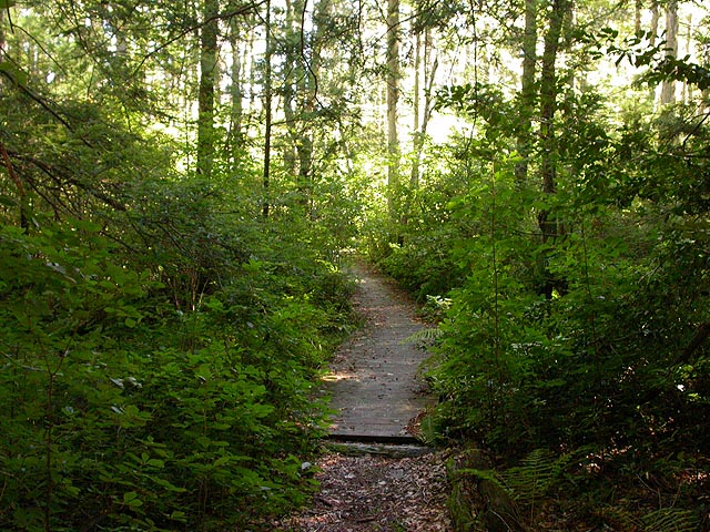i kept to the trail, taking a right turn after seeing an sign pointing me in the direction of the pond. the first time i came this sign mustn't have been here, because i probably kept on walking straight (to the powerlines) and never found the pond. i could smell the bog before i could see it, that warm, distinctive odor of sphagnum moss. i looked up and saw the boardwalk leading into the bog: this was what i drove all the way out here to see! like a child on christmas morning, i stepped into the bog.