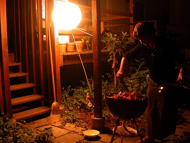 i stopped at the cafe briefly to grab some apples (along with some concord grapes, which were delivered later), before heading home. jawei was in his room taking a nap, but woke up soon afterwards. in the evening julie came over and made burritos (using the weber barbecue grill for the very first time this season). we initially had a hard time lighting the brickets julie brought over (they've might've been old), even using leaves and twigs to help start the burn (the dried leaves smelled like mary jane), but once we tossed in some crumpled colored circular pages, it lit up like a bonfire. we watched the red sox game, the home team losing again to the bluejays; now we're a game behind the yankees, who won tonight, but still tied with the indians for the wild card. with just 4 more games left in the regular season, i have no idea what's going to happen. a part of me wants the red sox to lose so i'm no longer held hostage by baseball. right now, i'm just preparing for the worst, hoping for the best.