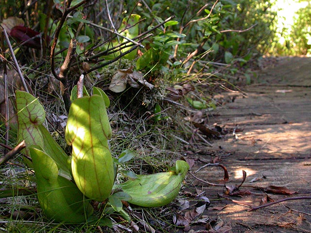 i wanted to call people and let them know where i was (but i had nobody to call to share the news with). if i could take a photo of something beautiful everyday, i think i'd be pretty happy. on either side of the boardwalk were carpets of green sphagnum moss, with various mushrooms growing from them like miniature umbrellas. the path ends at the pond, but also goes around it for a short distance. i was sort of disappointed with the lack of good pitcher plants (i saw a few walking in, but they seemed small and stunted), until i walked around the pond. the caretakers must've purposely planted pitcher plants besides the path because suddenly they were everywhere, big healthy specimens that spilled over onto the wooden boardwalk.