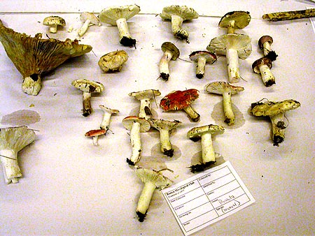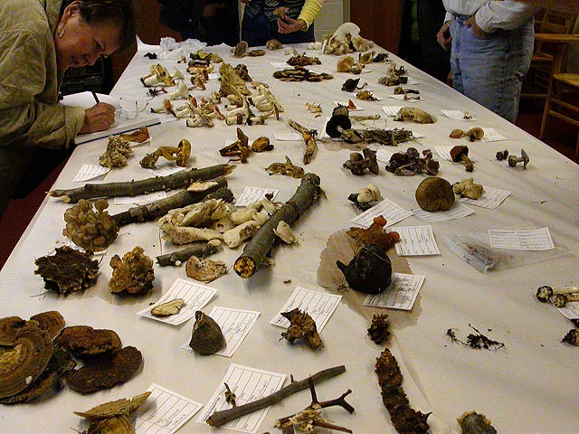 sometimes i wonder to myself, how can i combine my love of nature, my passion for eating, and my propensity for danger? combing the northeastern forest for edible wild mushrooms is how! i've always had a hands-off approach to all the mushrooms i've encounter while naturing. it's not like the idea of eating mushrooms hasn't popped up in my mind before, but i never felt my mycological expertise was great enough that i could identify an edible one versus one that'd make me sick or potentially kill me. that all changed tonight, when i went to paid lecture at harvard university hosted by the boston mycological club. i smelled the room before i found it, the strong odor of fungi. laid out on tables were various mushroom specimens, and people were circling around, identifying the species and writing the name on a card next to the mushroom. most of the folks there were late middle age or older. there were the definite mushroom nerds, as well as thegrandmothers, and the occasional epicurean looking to expand his/her food palette.