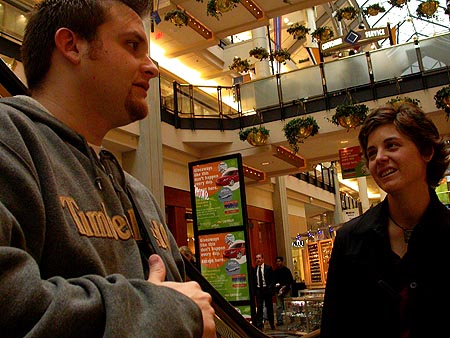 very soon it will be 4am and i will probably go to sleep after working an 18 hour day. i am exhausted to the point of delirium after animating 40 appliances. it's difficult to move around, i can really feel the force of gravity pulling me down to the ground. as tired as i am, i am also relieved that i finally finished, and now i'm feeling some of that post-project high (a bit premature though, i still have to tie up some strings tomorrow, but the bulk of the work is done, until the next deadline that is). i wasn't entirely working the whole 18 hours however; i went with julie to the galleria mall around noontime to play around with the macs at the apple store. judging by how crowded the place was, you'd think everyone was using a mac. i've decided that if i ever have $3000 to spend, i'm going to buy an apple 30" cinema display. that monitor is so beautiful and large that i think i will be dreaming about it tonight and many nights to come. we also ran into joel, walking around the mall on his lunch break from jury duty.