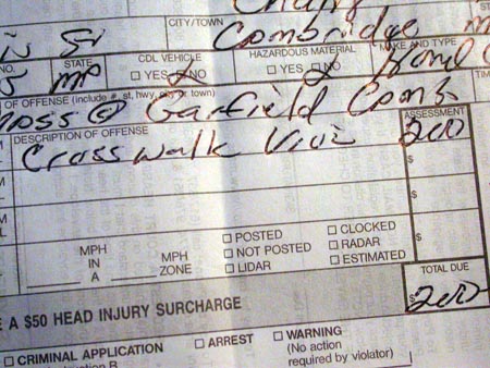 once i delivered the car, i switched to my motorcycle and raced home. i saw an old lady about to cross the street but i was going too fast to stop so i sped past her. seconds later i saw flashing blue lights in my side view mirror. a motorcycle cop was coming after me, told me to stop right on my street. i gave him my license and registration and waited for what felt like an eternity as he pulled my record. i felt detached, sort of thinking to myself, "what just happened?" looking up at the sky, thinking what nice weather we were having. the cop came back and told me i was being cited for failing to stop for a pedestrian. i took my $200 ticket without saying a word and rode the rest of the way to my place. in my 15 years of driving, this is my first moving violation. fishing through my pocket i realized i still had the car keys, so i went back to the cafe, being careful not to get pulled over again. my mother told me she'd just gotten off the phone with her credit card company to get a $100 late charge/interest-penalty removed.