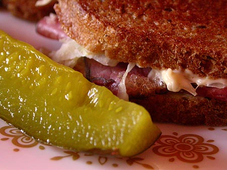 now i'm the kind of guy who plays russian roulette with my meat - boy that didn't sound right - what i meant to say is i will sometimes eat meat beyond its expiration date. like meat that's gone grey, i'll eat that. escherichia coli, salmonella, what's that? this corn beef on the other hand, i don't know a lot about meat, but i knew instinctively it wasn't good. first, there was this sticky layer of grease clinging on to it. second, it had a weird non-fresh odor. i figured nothing the old microwave can't help alleviate, but after throwing it in the defrost mode for a minute, there was no signs of improvement. i still wasn't sure if it was bad though, i couldn't quite trust my instinct, and i didn't want to throw away perfect good meat. so i called the expert - my mother. she was already screaming at me over the phone to throw the corn beef away when i told her it was sticky; i didn't even mention that it had a weird smell. thing is i was dead set on making reuben sandwiches, so i ran across the street and bought half a pound of deli sliced meat. it wasn't corn beef but a close peppery cousin. i came home and cooked. in 15 minutes i had 8 slices of reuben sandwiches, of which i ate 3. that was probably a mistake, because i felt gross afterwards, all greasy and bloated (more so than my usual).