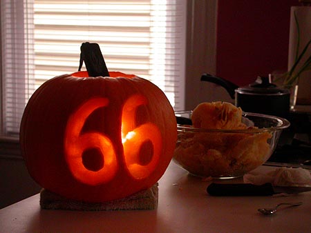 to help me procastinate i decided to investigate how i would go about making a pie with the medium-sized pumpkin i bought last week. i didn't know this, but the filling for pumpkin pie actually comes from the thick skin of the pumpkin itself; since i was going to carve the pumpkin for display, there wouldn't be any skin available for pie (besides, pies are made from smaller gourds known as pie pumpkins). i then went about hollowing out the pumpkin and carving it. jawei was home (he had the day off from school) and watched as i slowly worked the pumpkin over with a deboning knife and a small spoon. at one point i was scraping the pumpkin with my fingers and managed to separate a part of my nail from my finger itself (kind of painful).