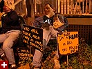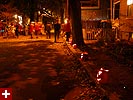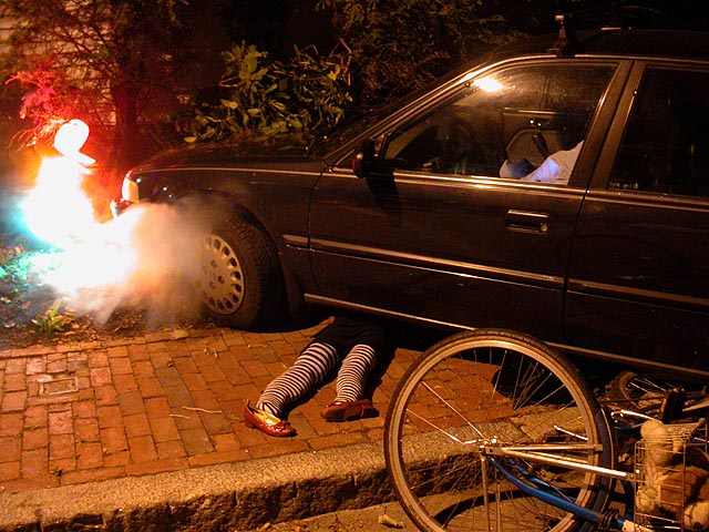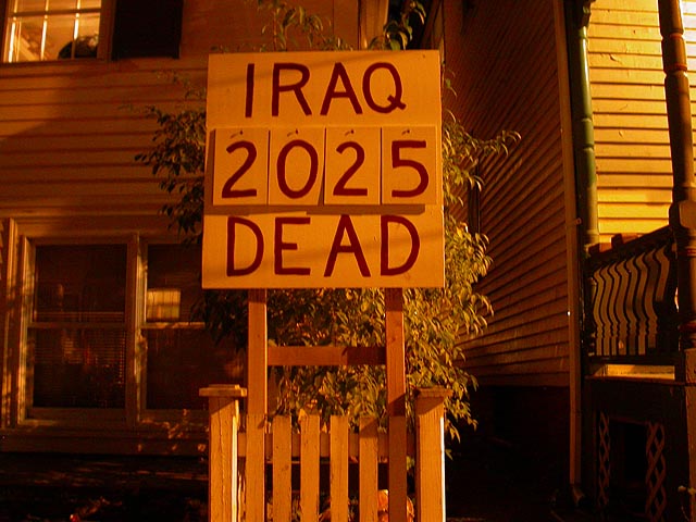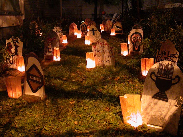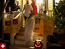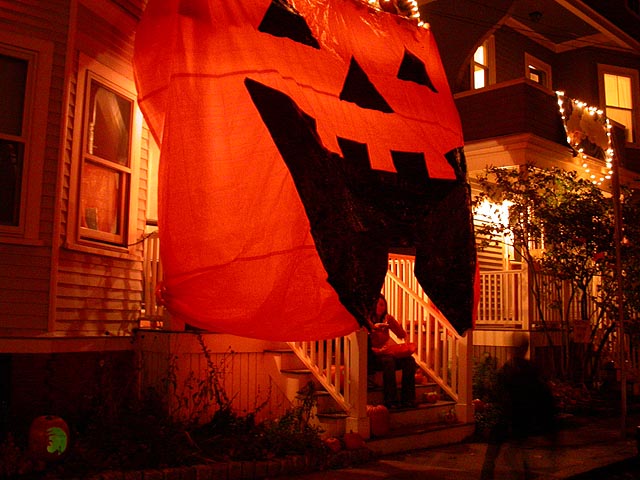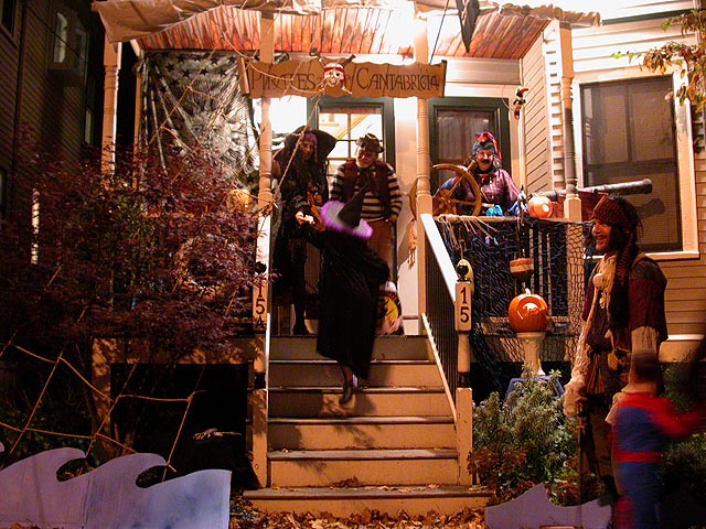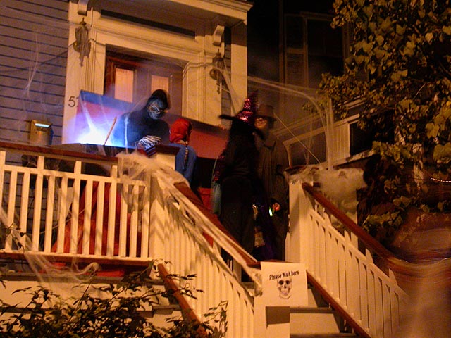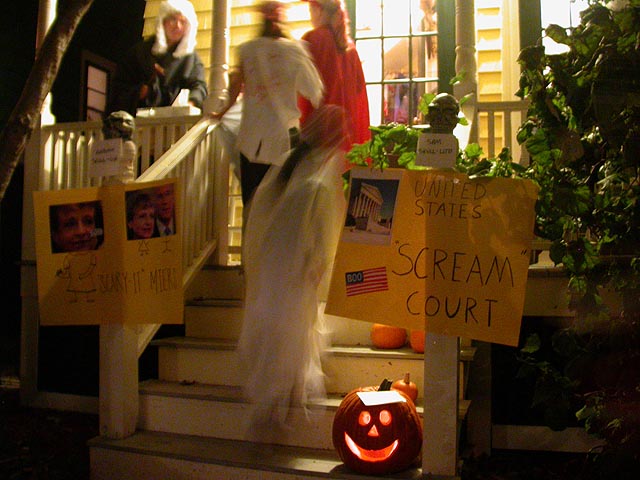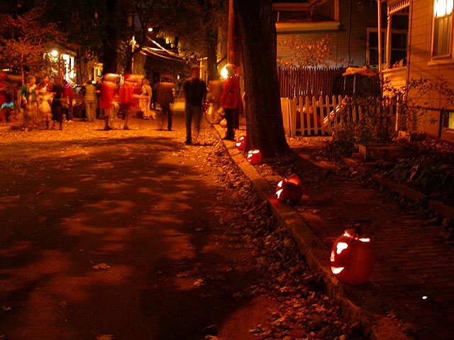 later, when i brought jawei out to see all the excitement, i discovered where all the kids were going: a few of the neighborhood side streets were converted into massive haunted communities. being that we're in cambridge, things had a political slant to them naturally; i'm sure the kids didn't care, they just wanted candy, but parents could appreciate the biting satire. there were references to gore/bush, supreme court nominees, as well as the war in iraq. the costumes spanned the whole spectrum of designs, from retro-hand-me-downs (teenage mutant ninja turtles? that's so 90's), to more recent favorites like characters from the incredibles. and what would halloween be like without girls in slutwear? i saw some bad santas, it's nice to see the tradition starting early. afterwards we went to star market to get a bit of groceries (all the halloween food were already on the liquidation table when you first walk in) before returning home.