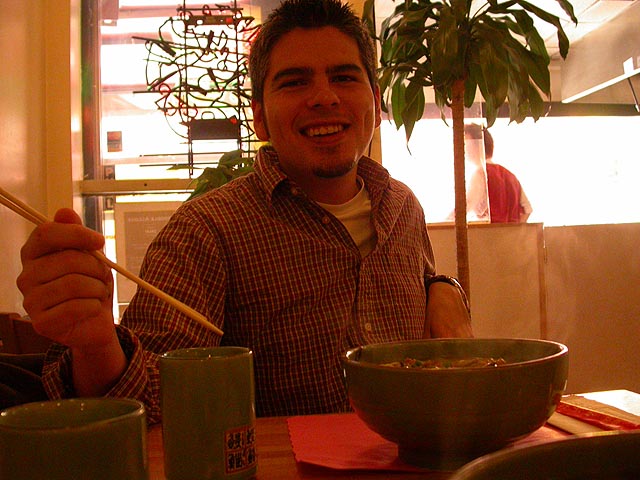 after i made a phone call to the client that made me sound like i was busy at home working for the rest of the day, i got on the bike and headed into chinatown to meet up with james for lunch at the noodle alcove. i twisted my neck earlier in the morning, so i had a hard time turning my head, lurching around like frankenstein's monster. it also didn't help the situation very much that i looked extra bulky because i thought it'd be cold and ended up wearing too many layers (it was actually surprisingly warm, although a bit windy).