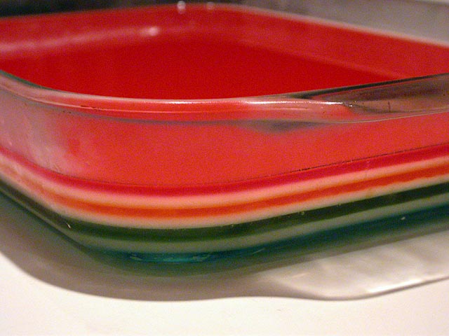 in the evening, my parents brought over suhan and we all had dinner at my place, several variety of sausages cooked on the foreman grill and toaster oven, served with an indian basmati rice medley. after they left, i started making a layered jello, which takes approximately 2 hours to make, each layer requiring 15 minutes to solidify (other than the first layer, which takes 30 minutes) in the fridge before i can add the next layer. tomorrow i'll cut up the jello and take some more photos. i'm not much of a jello eater, but i think they look pretty, and i like playing with them. isn't that what cooking's mostly about anyway?