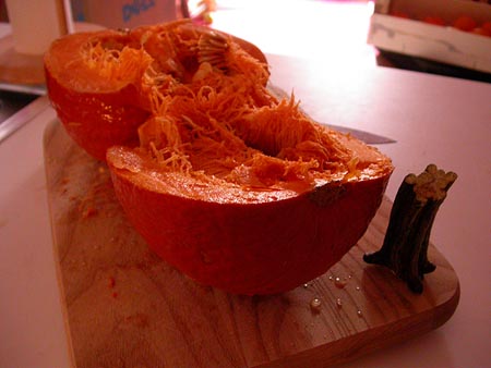the weather today was cold. for the first time this season the daytime temperature dropped into the freezing range and the water puddle across the street from my house is now a small ice pond. in the evening julie came over for some ribs dinner. she brought some salad as well as ingredients for baking pumpkin bread at my place. we also roasted some fresh pumpkin seeds (i didn't realize you're supposed to eat the shells as well).