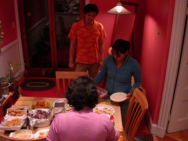 around 5pm my sister arrived with my aunt and suhan. i thought my great uncle was going to come as well but he decided to stay home and rest. the next 30 minutes was spent assembling the feast,