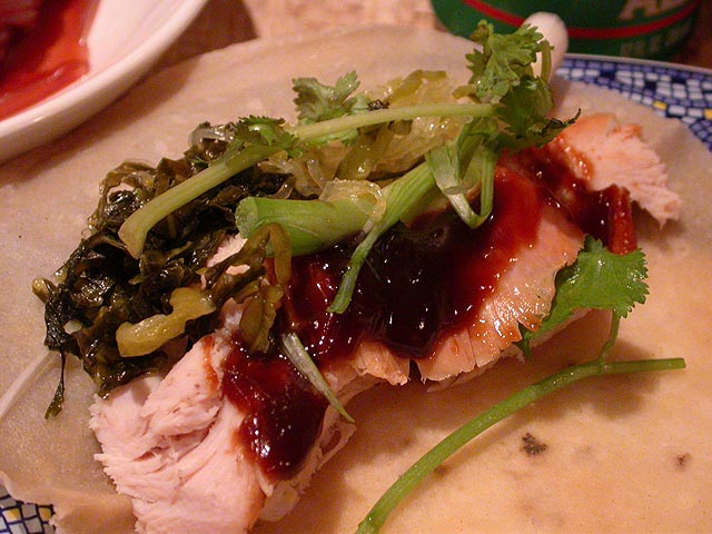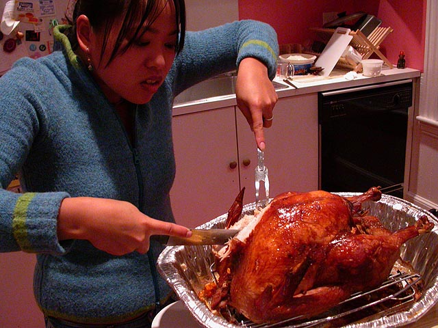with 12 different dishes of food, and 3 different kinds of dessert (flan, pumpkin pie, tiramisu). the turkey was cooked just right, but a bit salty (my sister revealed that she had added more salt to the marinade). after the first 2 turkey roll-ups (we eat our turkey peking duck style),