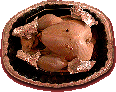 i moved the 12 lbs. turkey onto a roasting rack inside an aluminum baking tray. at 1:30 the turkey went into the oven at 325 degrees, and a little bit after 3 hours, the disposable turkey thermometer that i