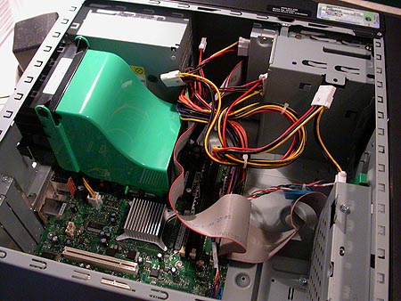 so it's a real surprise. it came with a 16" CRT monitor which i have no use for (i already have a 19" CRT). likewise, i didn't need the mouse or keyboard since i was going to attach this pc to my KVM switch. the first thing i did before i hooked everything up was to crack open the case and look inside. the dimension 1100 has the graphic card integrated into the motherboard - so no AGP or PCIe port. that's going to suck when i want to install a new video card so i can play doom 3 (although there are PCI cards). the one thing i've never seen before is a big green exhaust for the fan. after i powered up the machine, i spent the next hour uninstalling software i didn't need, all sorts of trialware and corporate tie-ins (AOL, netzero, musicmatch). i was tempted to just wipe the drive and reinstall the system but the install cd probably still has all these crapware. on a whim, i installed some software that made XP look more mac-like, but it got kind of weird using windows with an OS X interface so i switched it back.