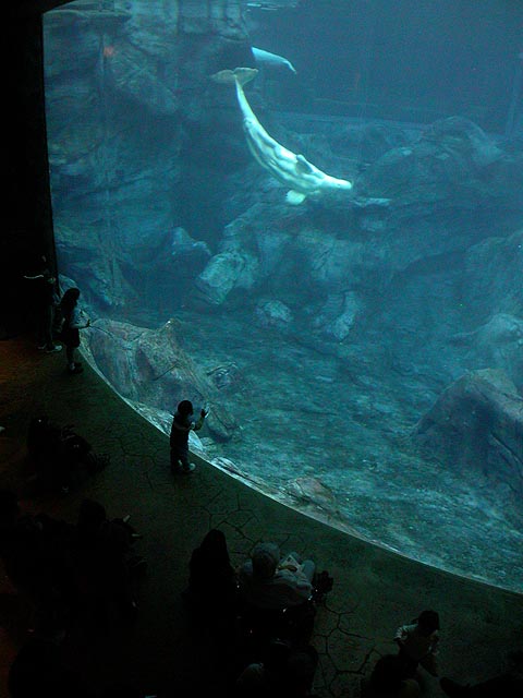 for their celebrity animal the aquarium decided on their quartet of beluga whales - which surprised me, because when i went to that osaka aquarium, their celebrity animal was their only whale shark - and here at this aquarium, they had a pair of whale sharks but they weren't even advertising them as their showcase attraction! personally, beluga whales to me resemble overweight albino dolphins without the characteristic smile. one of the whales was rescued from a mexican zoo and was recovering from an unslightly skin ailment.