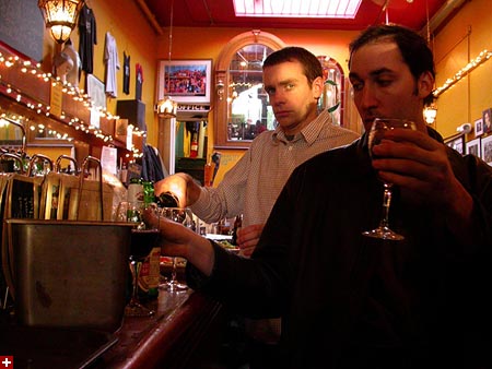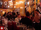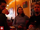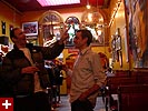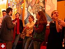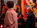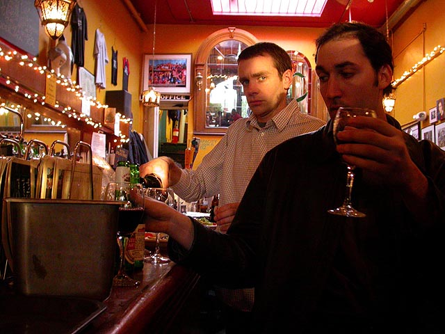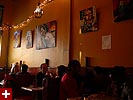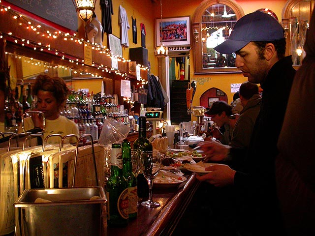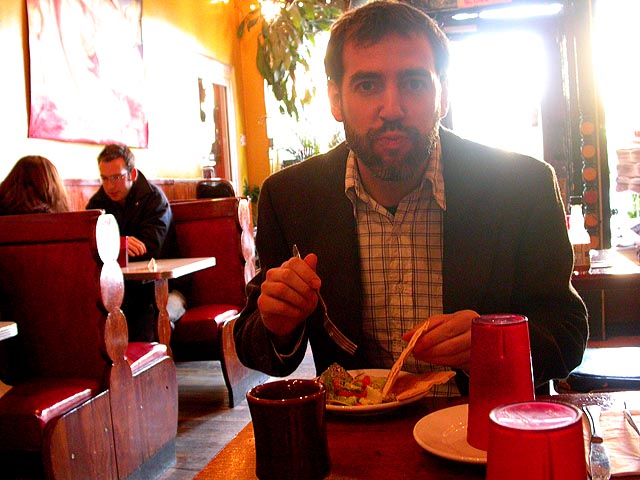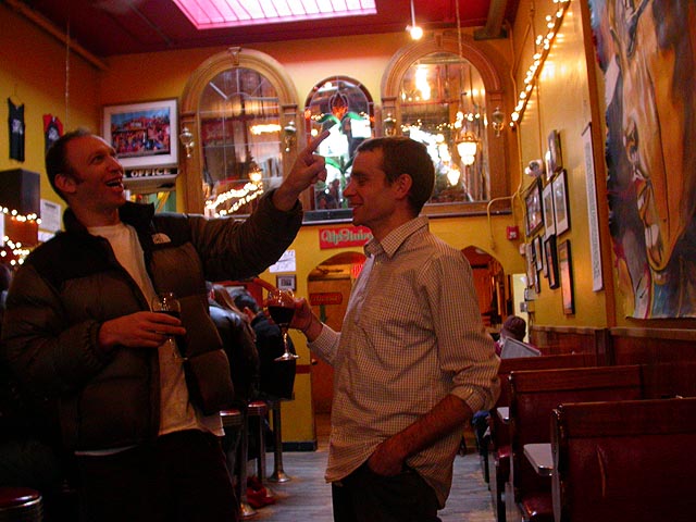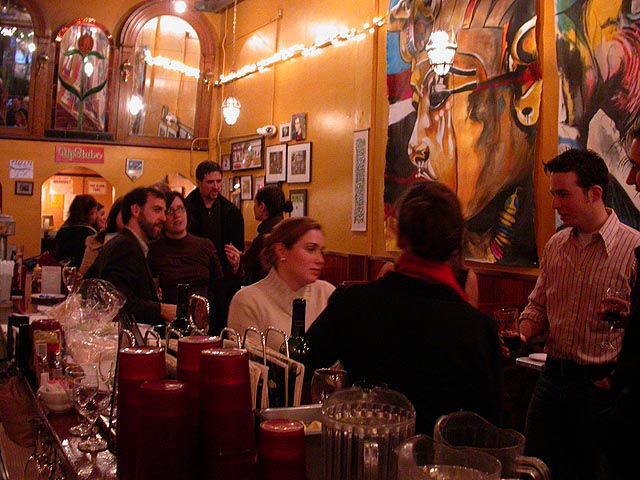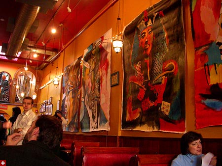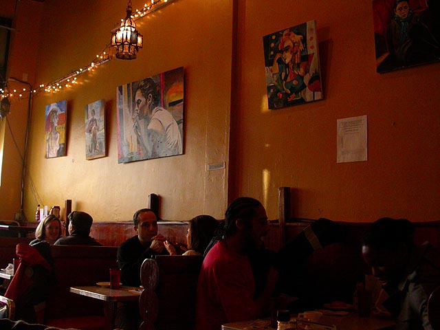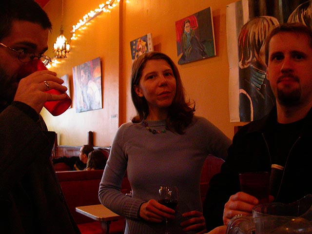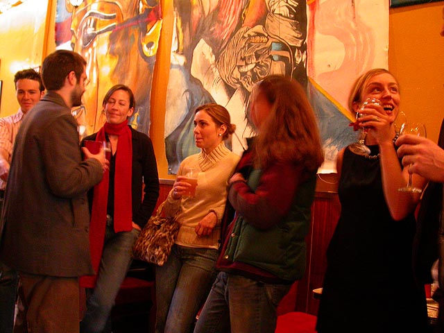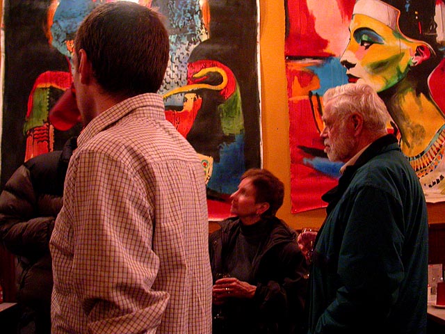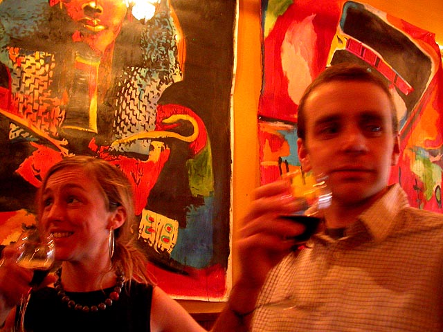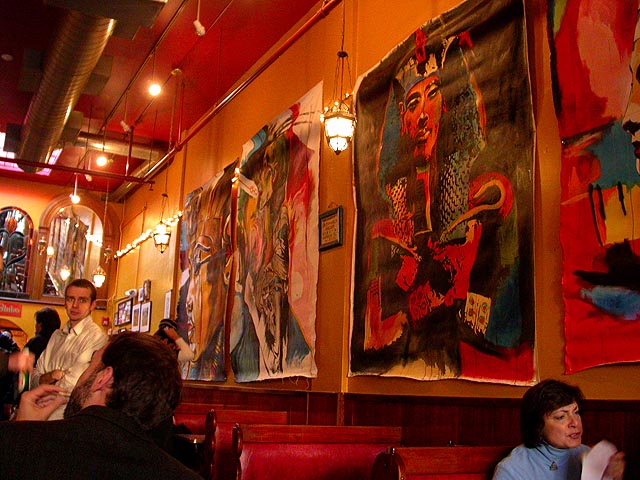 dan and i grabbed the 83 bus out of porter square and went to central square to catch rob's art show at the middle east. i remember when i first met rob many years ago in the early days of screen house, he had a habit of carrying around this painting of a pharoah's portrait he was working on, as if to show the world he was, in fact, a painter. and to think one day it'd all lead to this! rob's style features a lot of splashy colors and a fondness for all that's egyptian and all that's kate moss. half the people were invited guests, while the other half were patrons who enjoy spending a sunday afternoon hanging out at a bar-restaurant. there were plates of food for the early birds, and 4 bottles of wine that were brought out as the afternoon wore on.