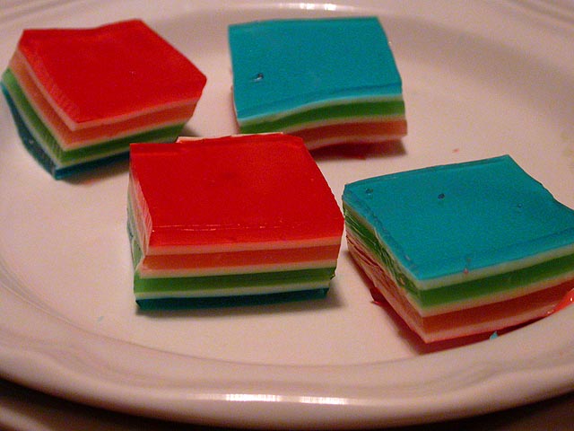 i may never want to eat again after tonight. absolutely stuffed and wanting nothing more than to go to sleep, the sight of leftovers still sitting on the dining table repulsed me. next time chinese hot pot, i'm through with turkey and big banquet style dinners that involve over a dozen different dishes. my family (including my 2nd aunt, my great uncle, and suhan) had christmas dinner at my aunt lili and uncle matthew's place in arlington. even though we agreed this year we wouldn't be exchanging any presents, i broke the rule and got them a solar-powered rainbow maker. after my second turkey roll-up i was already done, but i made room for 2 more. i had a hard time removing my rainbow jello from the dish and there was no way i was going to eat another flan. my father was the first to leave with my great uncle and suhan, while the rest of us stayed and helped clean up before going as well.