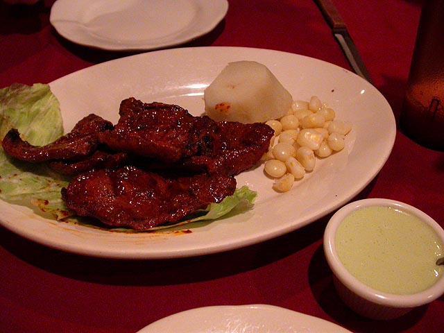 since it was my turn to cook but i was busy all day, i asked julie if she wouldn't mind eating out tonight. we decided on the peruvian restaurant machu picchu in union square (somerville). for a cold weekday night the place was doing pretty good business, with a lot of spanish-speaking customers who may or may not be peruvian. just an observation, but peruvians look sort of asian; i wondered if i ever visited that part of the world, whether or not i could blend into the population by trimming my goatee into a stylish moustache. earlier i'd done some research on peruvian food and i was hoping they'd have cuyes, otherwise known as guinea pig. no such delicacy, but they did have anticuchos; you knew it was good because it was one of the few items without english translation (anticuchos is ox heart kebabs). i knew i had to have it. julie went with a cerviche dish for the main course, while i had the bistec. our waiter was a nice gentleman who seemed to be running the restaurant all by himself (although i spied at least one cook in the kitchen when he went back).