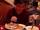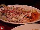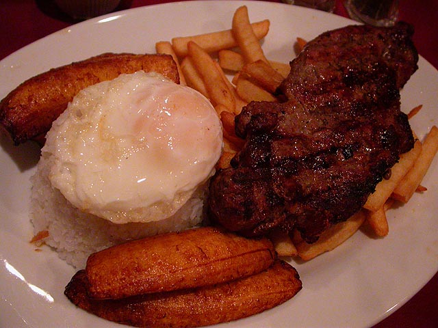 it was a large dish of seafood, served cold, heavily marinated in lime juice. turns out that's exactly what cerviche is: seafood cooked naturally by the acid in citric juice. we were both expecting a warm-cooked meal but what we got was a bit of a surprise. julie ate her cerviche heartedly though, which is ironic because she won't even touch sushi because she can't stand raw fish. i watched as she dug into her plate of peruvian fear factor; besides fish, there was also octopus, snails, scallops, and maybe a few other unidentifiable sea creatures. my bistec (mild in comparison) came with french fries and fried plantains. at one point the waiter gave us a different hot sauce to sample after seeing us finish the first sauce. i worked my way through half my steak before i decided to spare julie anymore gastronomical hardship by switching food with her.