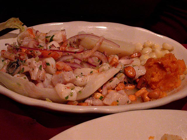 the anticuchos came with a pale green colored hot sauce as well as these "beans" that looked like enormously large corn kernels. ox heart tastes a little slimy and chewy, although the barbecue flavoring and the hot sauce made you forget about the texture. next came julie's cerviche. now i've heard that word before, but never really knew what it was.