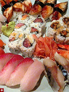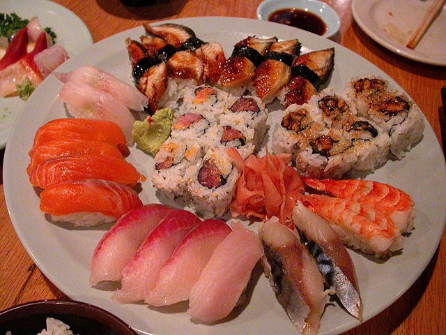i had dinner with my friend gary and his friends chee-ping and angela. we waited for angela to arrive at the porter exchange mall, and then once she got there, we waited some more for a table at the blue fin restaurant. for a monday night the place was doing a pretty good business (i even had another robert reich sighting). there was a hodge podge of language being thrown around. the lingua franca was mandarin chinese, with both gary and i hailing from taiwan, chee-ping from malaysia, and angela from hong kong (knowledgeable in cantonese, slowly learning mandarin). our wait staff spoken english and japanese, and occasionally gary and chee-ping would swear at each other in taiwanese. angela was given the responsibility of ordering for us (although i made sure we got some unagi (eel) - my favorite). the whole night she tried to convince me to go skiing with them this weekend. by the time we left, we had consumed $100 worth of sushi and sake.