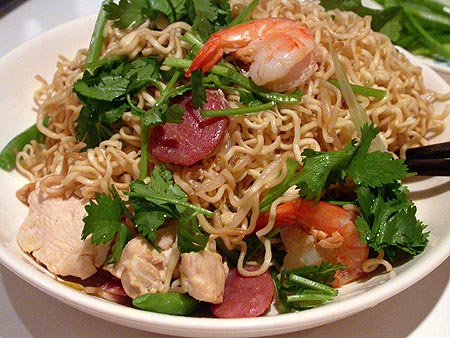 the only real nice thing that can be said about tonight's dinner was it was edible at least. i made some sort of stir-fry involving chicken, chinese sausages, and shrimps, tossed with egg noodles. of course it looked nothing like the photo in the recipe book. i ended up using too much egg noodles which seemed to suck the whole dish dry and it was a bland affair overall. i think it's my first time using shrimps though, they're fun to cook with because they turn pink when they're done. i think i've lost my cooking mojo (not that i had very much to begin with). i think 80% of the time, what i make is barely edible. but i still continue cooking anyway, i'll get it right someday.