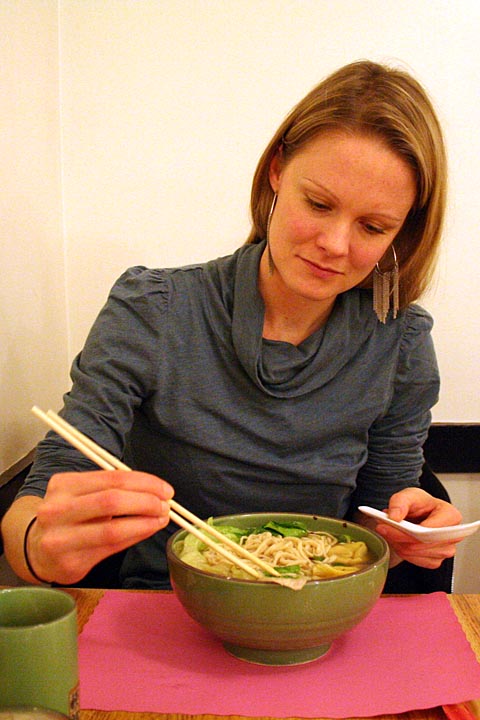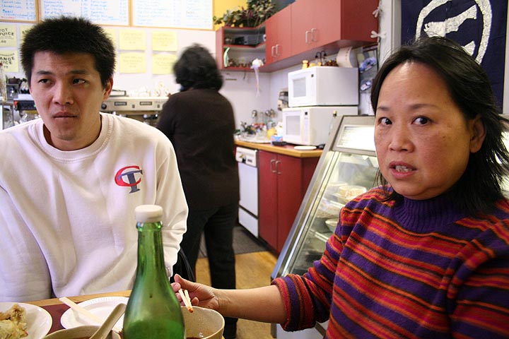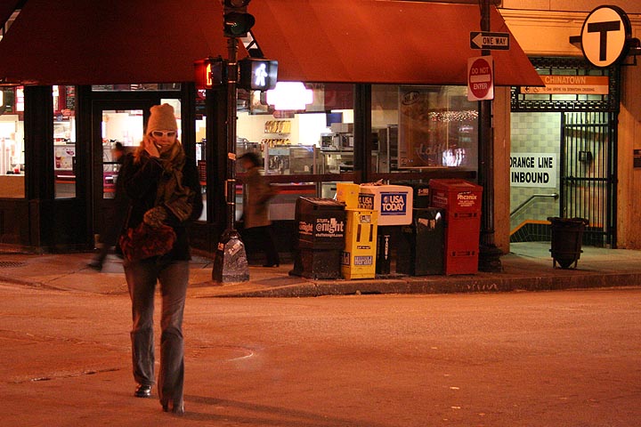 afterwards eliza and i ventured to nearby chinatown to get some dinner. we went to the noodle alcove, and i was surprised that i never brought eliza here before (since i've brought just about everyone else). the manager - who recognizes me by now - must think i'm the most popular guy in boston, always bringing somebody else new to dine with! eliza filled me in on some former SRM employees news. she seemed to have some trouble with the chopsticks and ate her noodles spaghetti style, wrapped around those two sticks. after we finished with dinner we walked back to the T. along the way we watched a bevy of young girls in glittery tube topped club wear running down the street in the bitter cold (my camera was too buried in my bag to dig out in time for the perfect photo op). eliza high-fived me with her mitten then descended down the chinatown station. i fast-walked my way to park street, cursing at the cold, wishing for the warm comforts of home (even coding an 18-hour day seemed like a paradise in comparison).