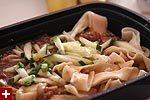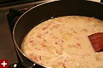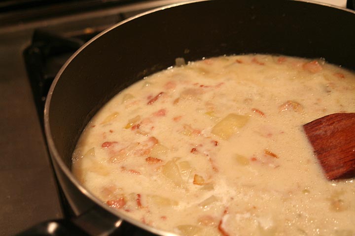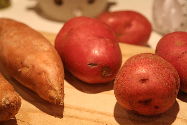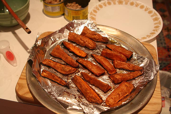 with my brain fried, i was still able to do work, although just the easy stuff. julie came around in the evening for dinner. she practiced making knots while i made spicy sweet potato fries and clam chowder. this was my second time making chowder and i've learned to avoid some earlier mistakes. for one thing, i skinned the potatoes and cut them into smaller pieces - the problem i had the first time was my potatoes were too chunky and too undercooked. this time around, i ended up making a pot of chowder i can be proud of. julie didn't think it was clammy enough (i personally like a chowder that's less clammy) and added some salt to hers (i felt it was salty enough as is). the fries came out well too, although a bit scorched on one side (the side that was facing down, surprisingly). the sugar coating carmelized while the pepper powder made it spicy.