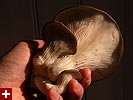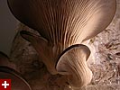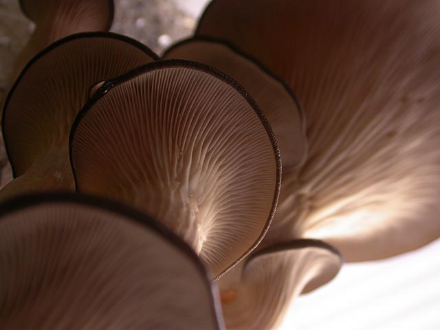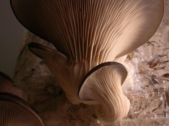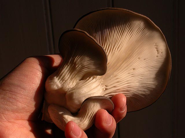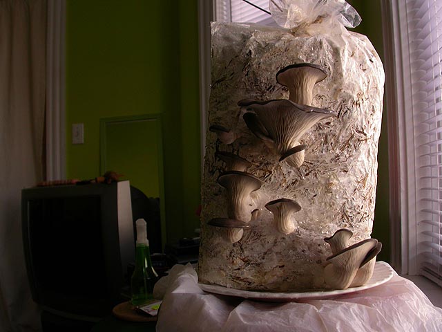 i had to harvest one of the mushrooms today; once they get about a few inches wide and start looking like their caps might be folding upwards, it's time to pick them. unfortunately, because oyster mushrooms grow in clumps, i ended up pulling a few other smaller mushrooms as well. one clump isn't enough to eat yet, so i put this one away safetly in the refrigerator underneath a wet paper towel (which should keep for a few days at least, hopefully enough time for some of the other mushrooms to ripen).